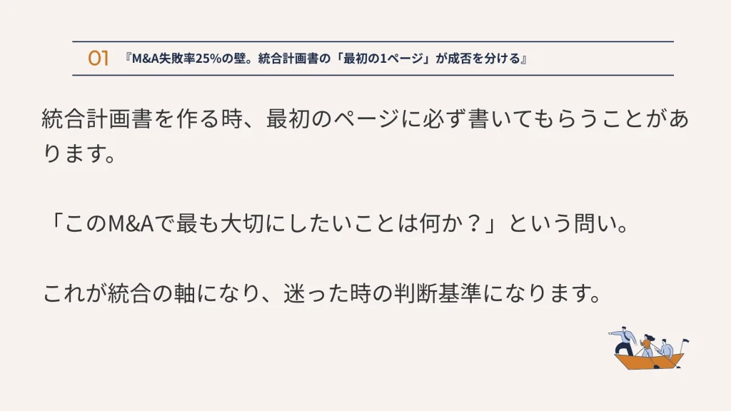 M&A失敗率25%の壁。統合計画書の「最初の1ページ」が成否を分ける